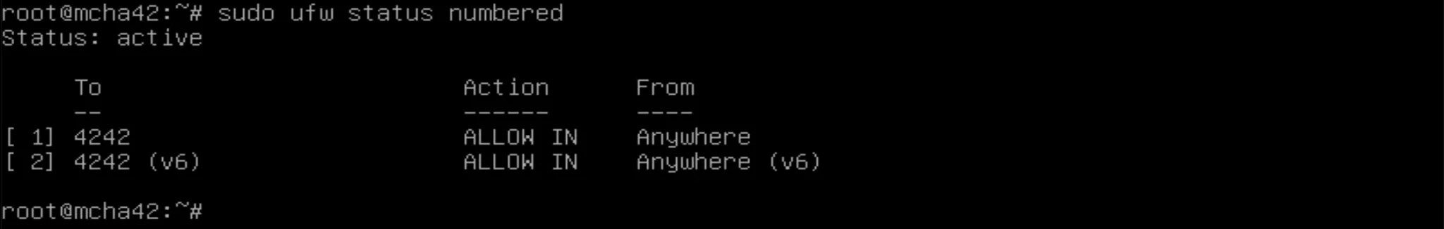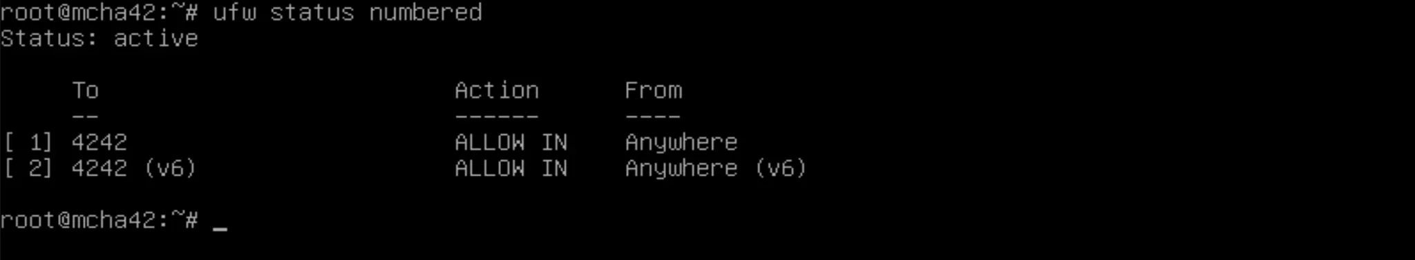 SSH 진행 단계에서 ufw에 4242포트의 tcp 프로토콜도 허용하는 단계를 거쳤는데, 과제 Document를 보니 ufw status 시 아래와 같이 출력이 되어야 한다. ( numbered 옵션은 선택 )