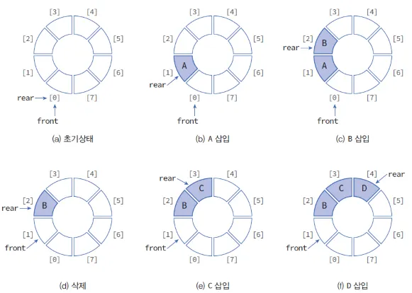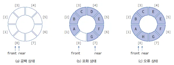 그림에서 볼 수 있듯이 큐의 모든 공간이 자료로 꽉 차 있으면 오류 상태로 인식한다.