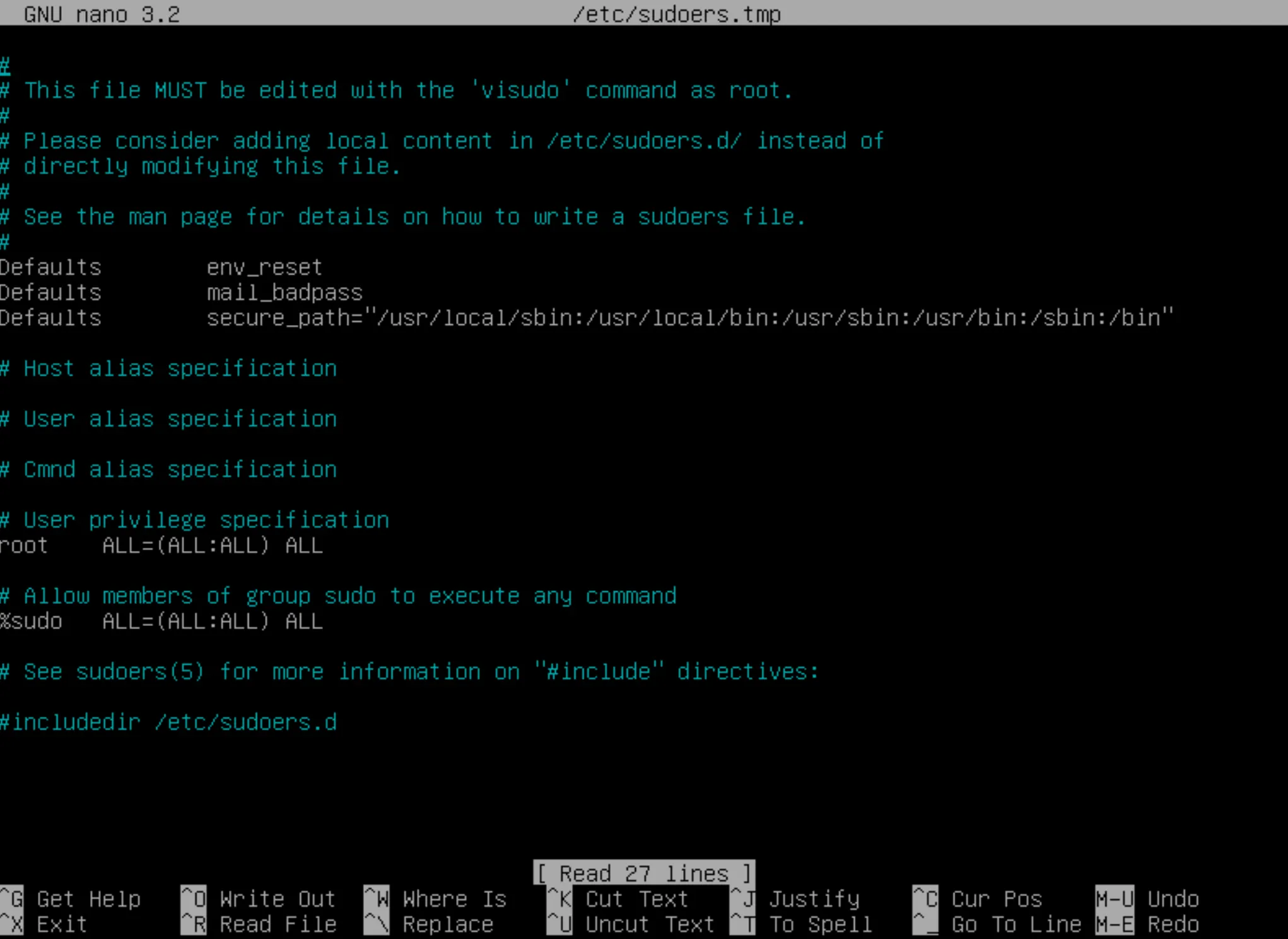sudo 설정을 위해 nano 에디터로 설정 파일 오픈