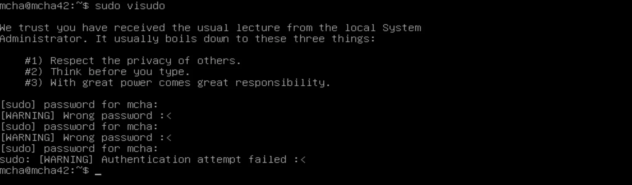 authfail_message | sudo 인증(root 권한) 실패 시 나타나는 메시지 |