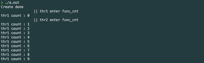 thr1과 thr2를 각각 쓰레드1, 쓰레드2라고 할 때 pthread_create 함수를 사용하여 쓰레드를 생성하면 지정한 func_cnt 함수가 수행 된다. func_cnt 함수는 전역 변수인 cnt를 1씩 증가시키며 해당 스레드의 문자열과 현재 cnt를 출력한다.