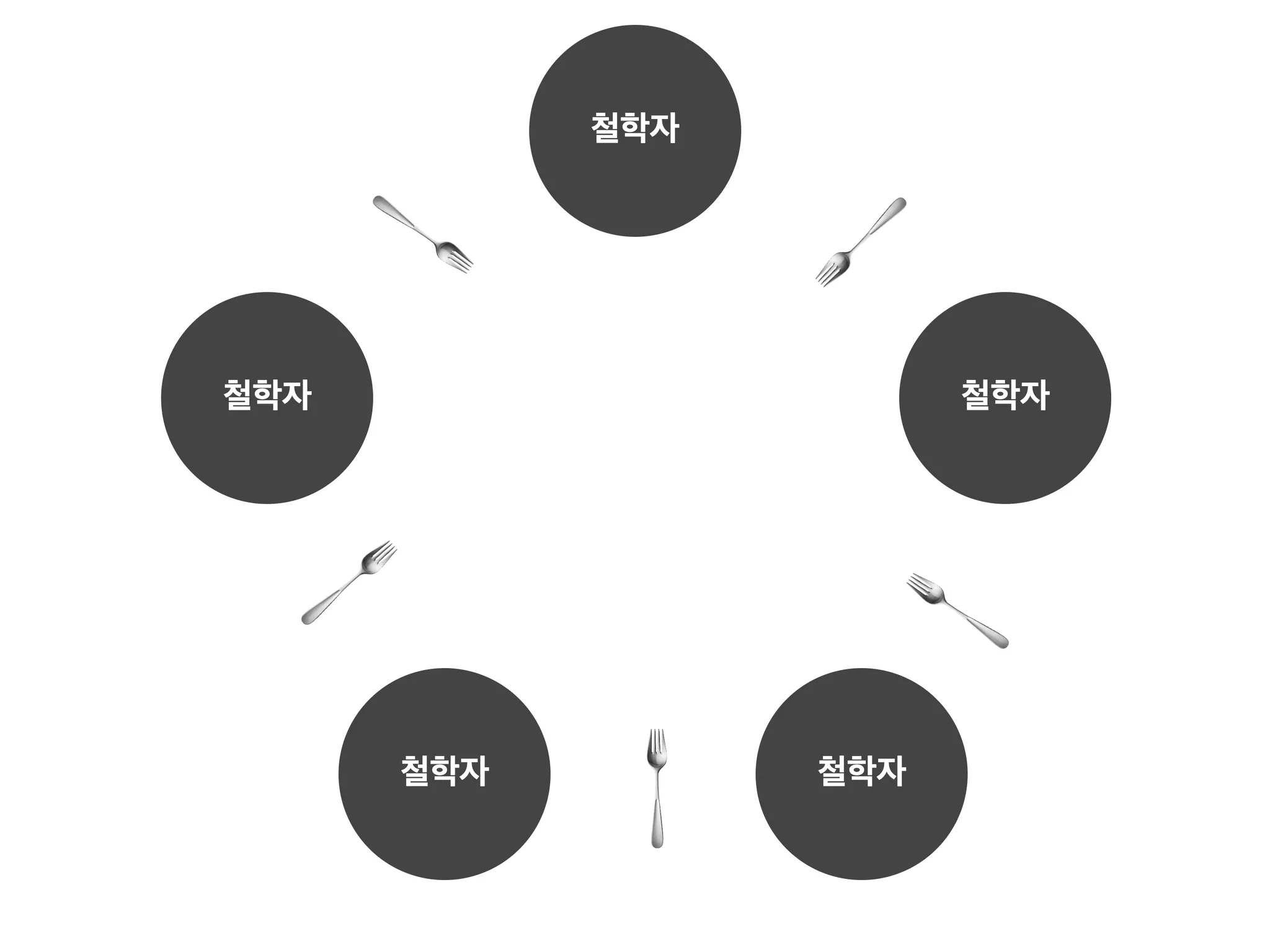 큰 문제가 없어보이는 식사 과정이지만, 만약 모든 철학자가 동시에 자신의 왼쪽에 있는 포크를 집어들었을 때