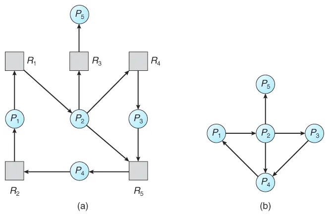 시스템은 프로세스와 자원의 상태를 아래의 그래프와 같이 유지하며 프로세스의 요청에 대해 순환 대기 상태가 발생하지 않는 경우에만 자원을 프로세스에 할당한다.