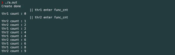 이 예제 같은 경우는 mutex 라는 이름을 가진 뮤텍스를 통해 cnt를 증가시키는 while 부분을 선점(독점)하고 있다. 그 결과 thr1와 thr2가 동시에 func_cnt를 수행하지만 mutex를 먼저 선점한 thr1이 cnt를 증가시키는 것을 볼 수 있다.