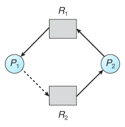 각 프로세스(P1, P2)에서 R2(Resource)로 뻗어나가는 점선 화살표를 예약 화살표(Claim edge)