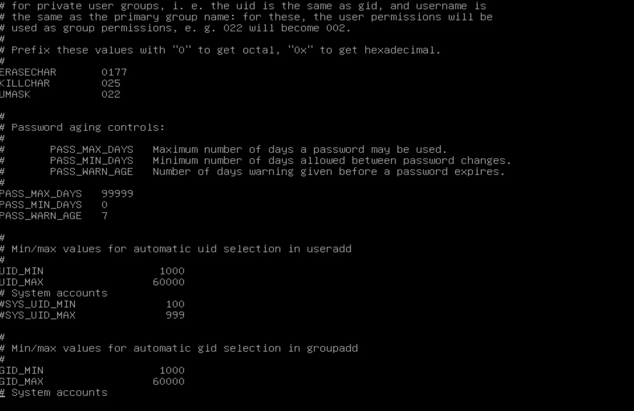 ์ค์ ์ ์ํด ์์ ํด์ผ ํ๋ ํ์ผ์ /etc/login.defs์ ์๋ค.