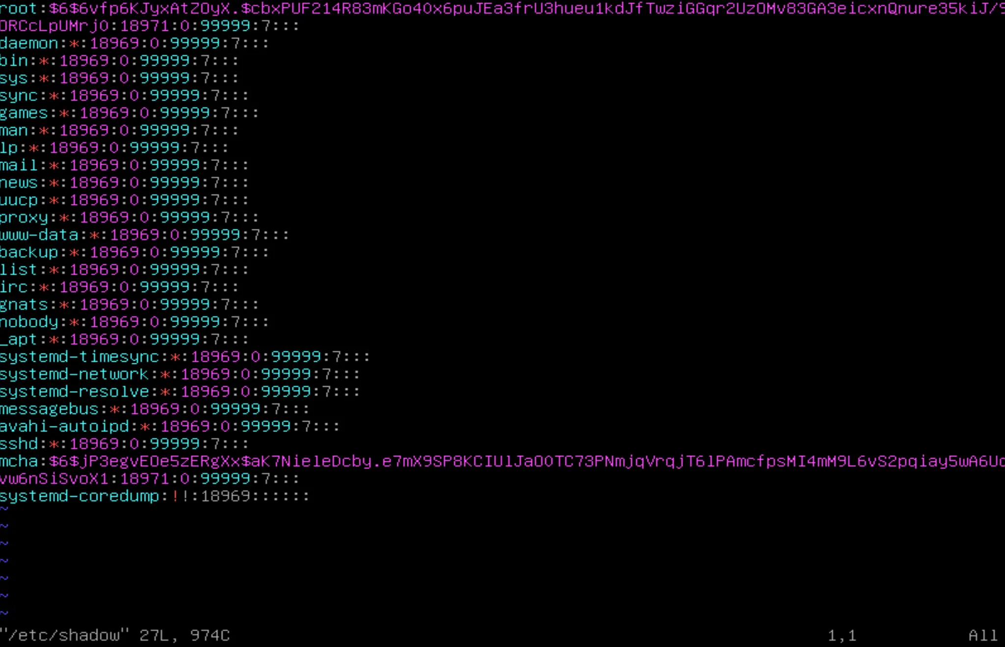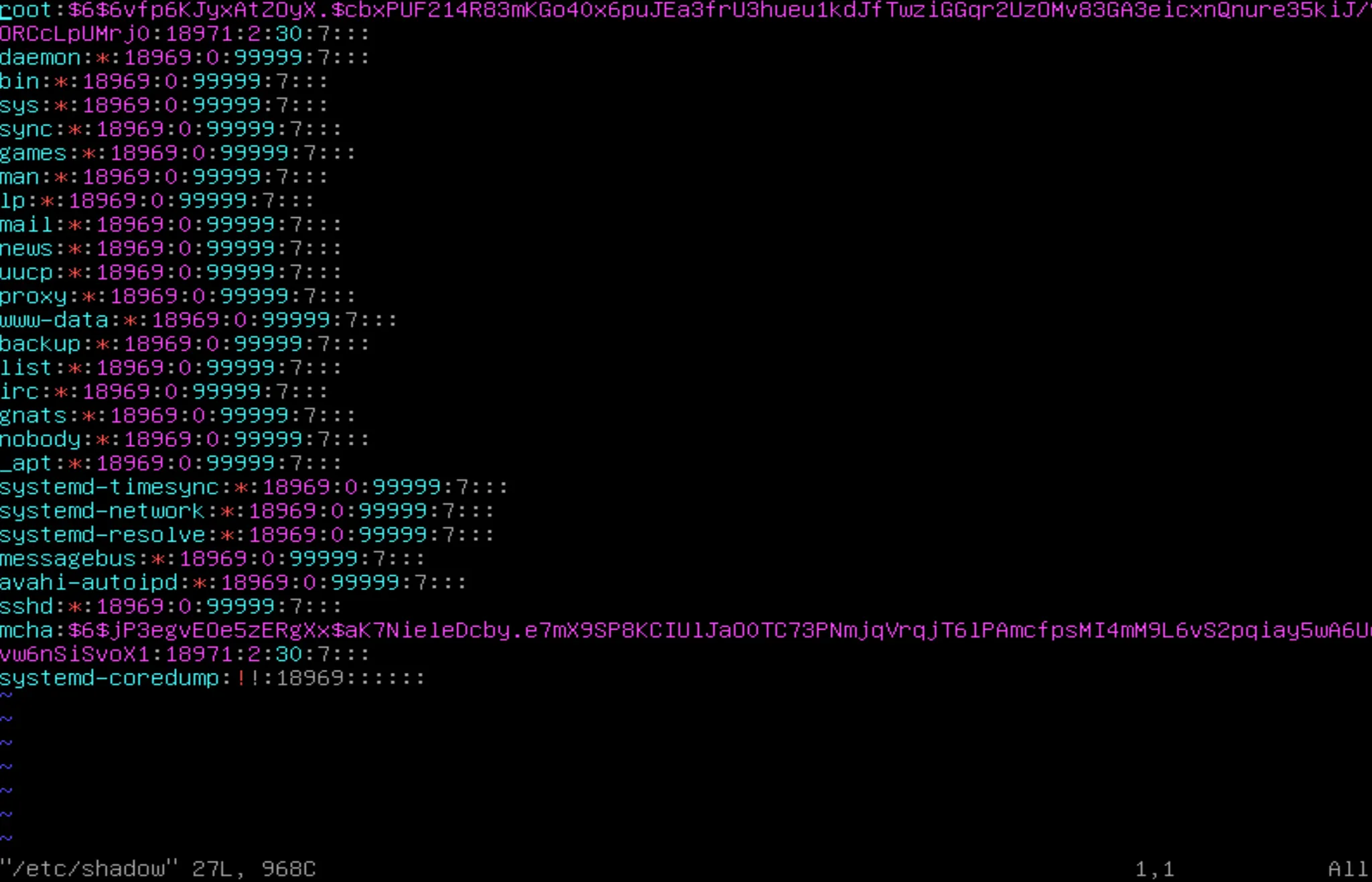 /etc/shadow ๋ฅผ ํ์ธํด ๋ณด์์ ๋ root ์ mcha ์ ๋น๋ฐ๋ฒํธ ์ต์ ์ฌ์ฉ์ผ, ์๋ฉธ ์ผ, ๊ฒฝ๊ณ ์ผ์ด ๋ณ๊ฒฝ ๋์ด ์์ง ์๋ค. ๋ฐ๋ผ์ ์๋ ๋ช