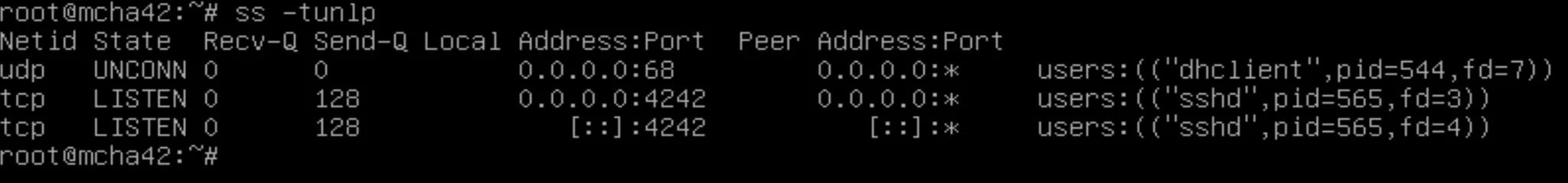 ss -tunlp์ ๊ฒฐ๊ณผ. dhclient ํญ๋ชฉ์ด ์์ด์ง ๊ฒ์ ๋ณผ ์ ์๋ค.